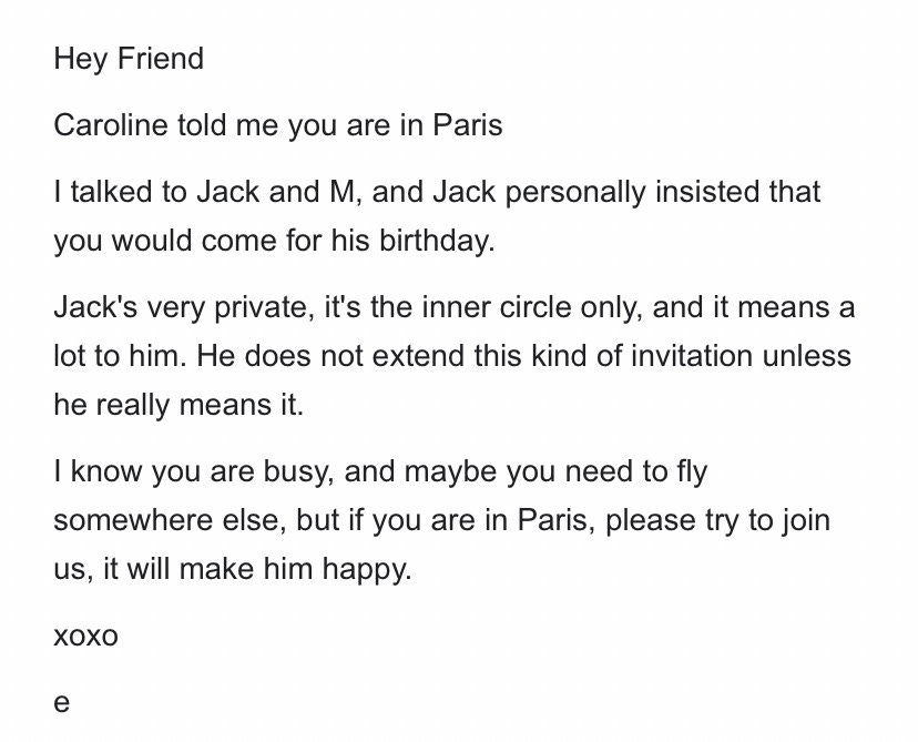 A l’occasion de ses 60 ans, c’est Karyna Shuliak, la girlfriend bielorusse, qui semble s’y coller et adresse des e-mails à des personnalités pour leur demander un texte de souvenirs pour un petit livre à offrir à son anniversaire. Le thème “un repas partagé avec Jeffrey et ses amis farfelus”, pour avoir “des histoires intéressantes de ses amis intéressants”.. Et là on comprend ce que sera le cadeau : l’équivalent papier des photos qui trônent déjà partout chez lui : la liste de toutes les relations dont il peut se flatter.